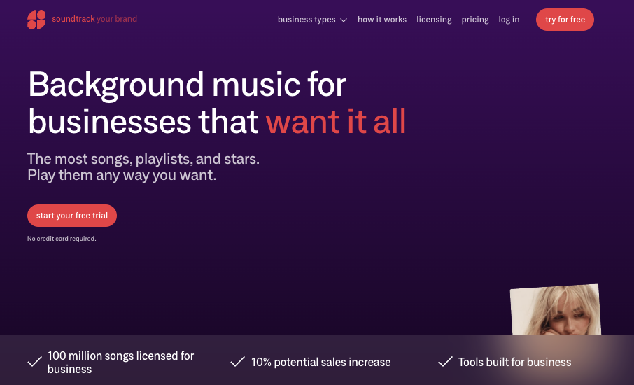 Why it stands out: Soundtrack offers one of the biggest music catalogs of any streaming service, with over 120 million songs and 1,200 playlists, licensed for businesses in 74 countries. With its Unlimited subscription, it’s the only on-demand commercial streaming service that lets you play what you want, when you want, without having to wait in a queue.