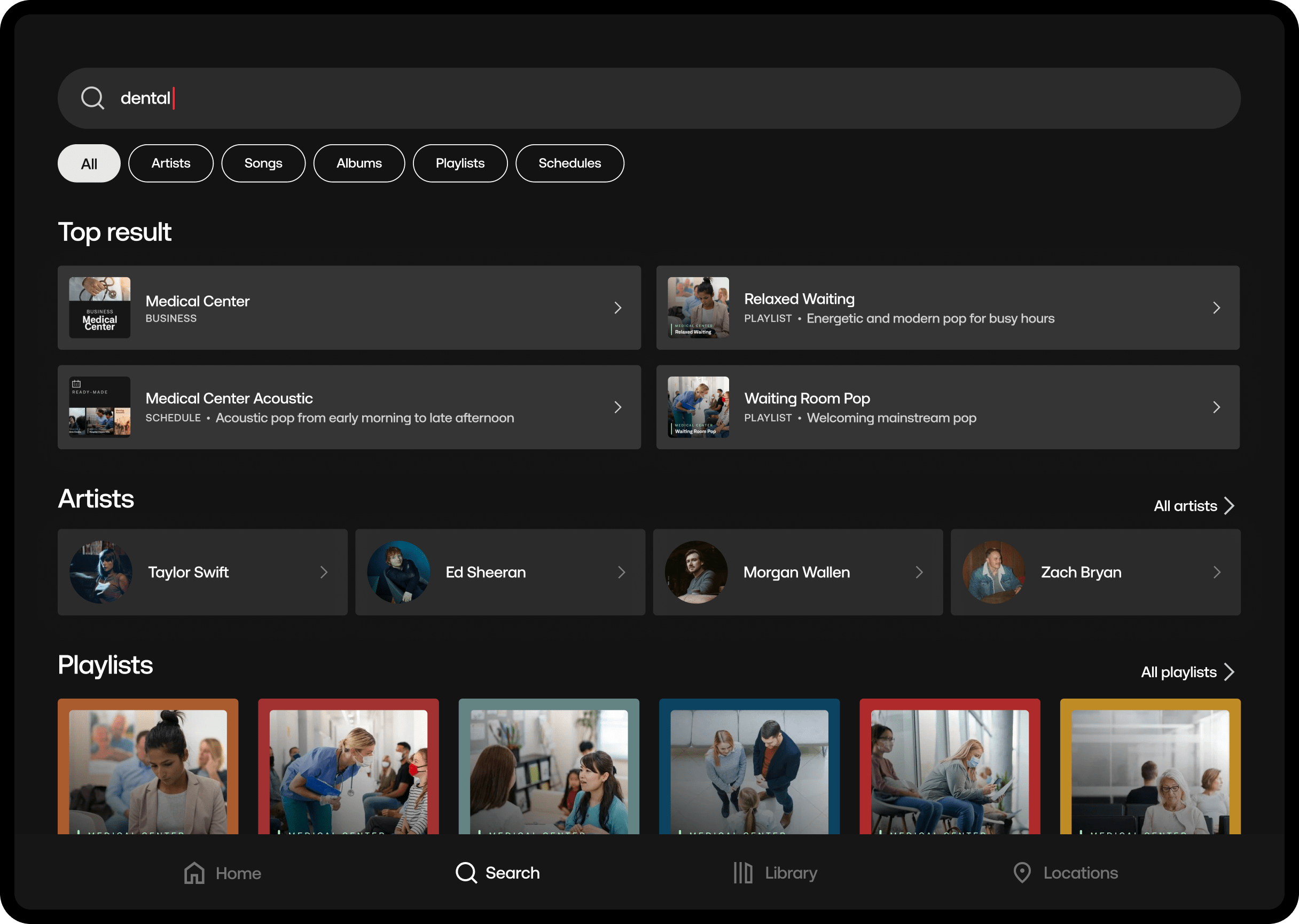 Elige la música de Soundtrack y eleva la experiencia en tu clínica dental con lo mejor de su clase. Haz Reproduce en streaming desde una plataforma creada para su uso en entornos profesionales y disfruta de una gran variedad de funciones concebidas para negocios.