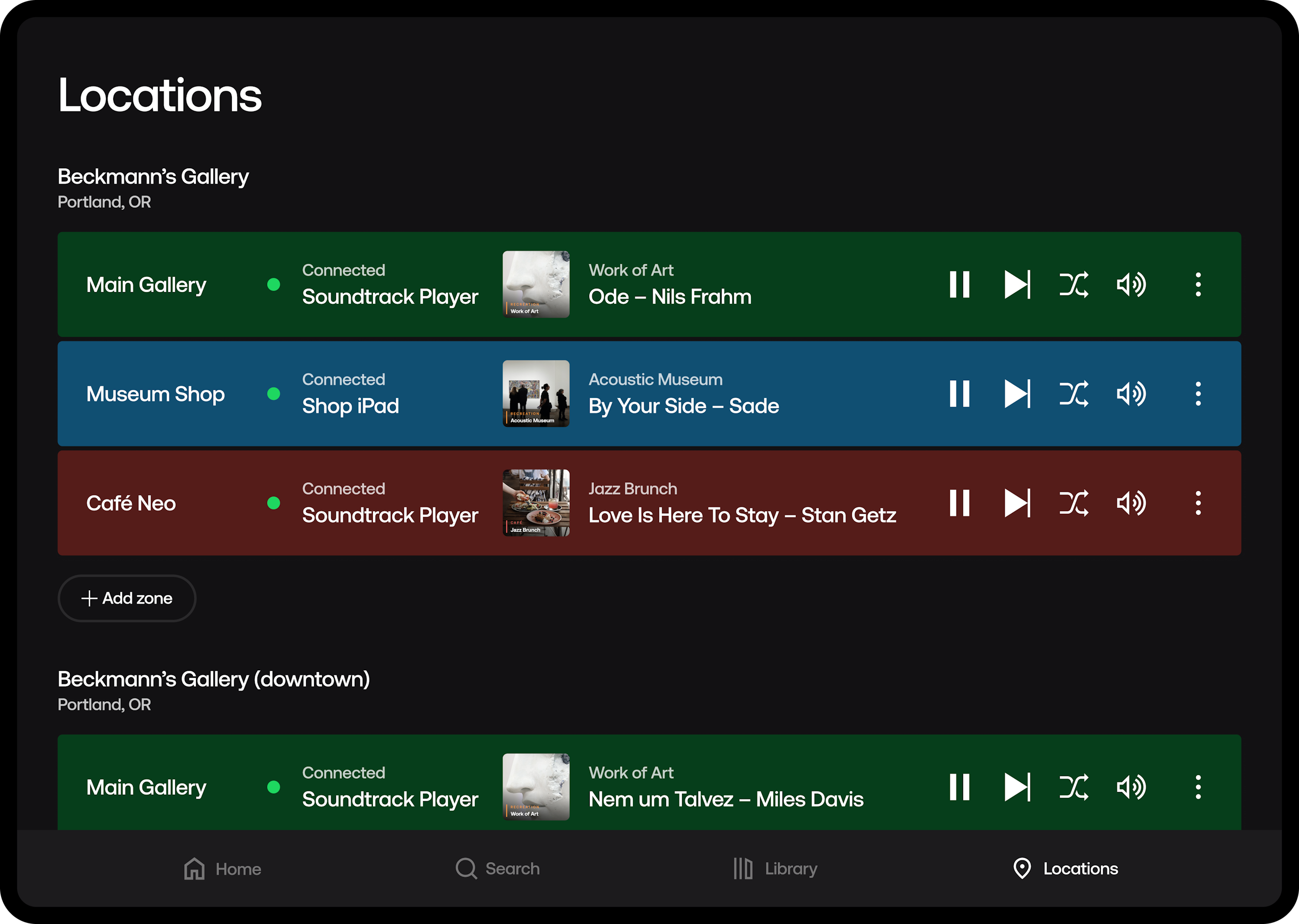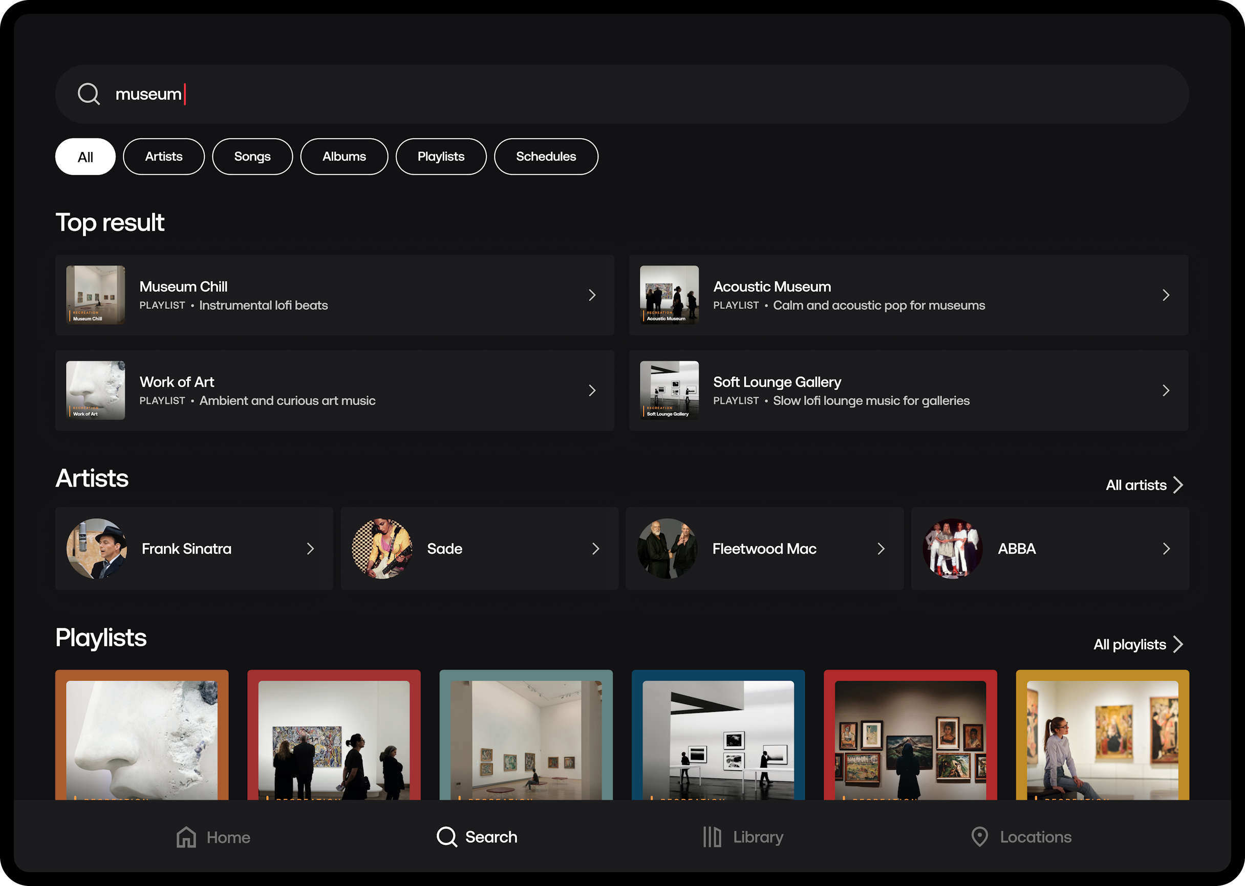 Ameniza la visita a tu galería, museo o exposición con Soundtrack. Elige entre un catálogo musical formado por más de 100 millones de canciones con licencia y ofrece una rica experiencia multisensorial a tus visitantes.